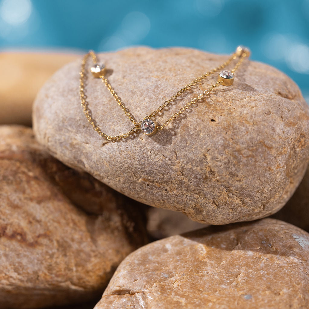 Made with waterproof, tarnish-resistant 18K gold and delicate CZ bead charms, this anklet is as carefree as your next beach getaway and as timeless as the tides. Whether you’re diving into ocean waves, lounging by the pool, or dancing barefoot in the sand, this anklet stays with you—shimmering through every adventure.